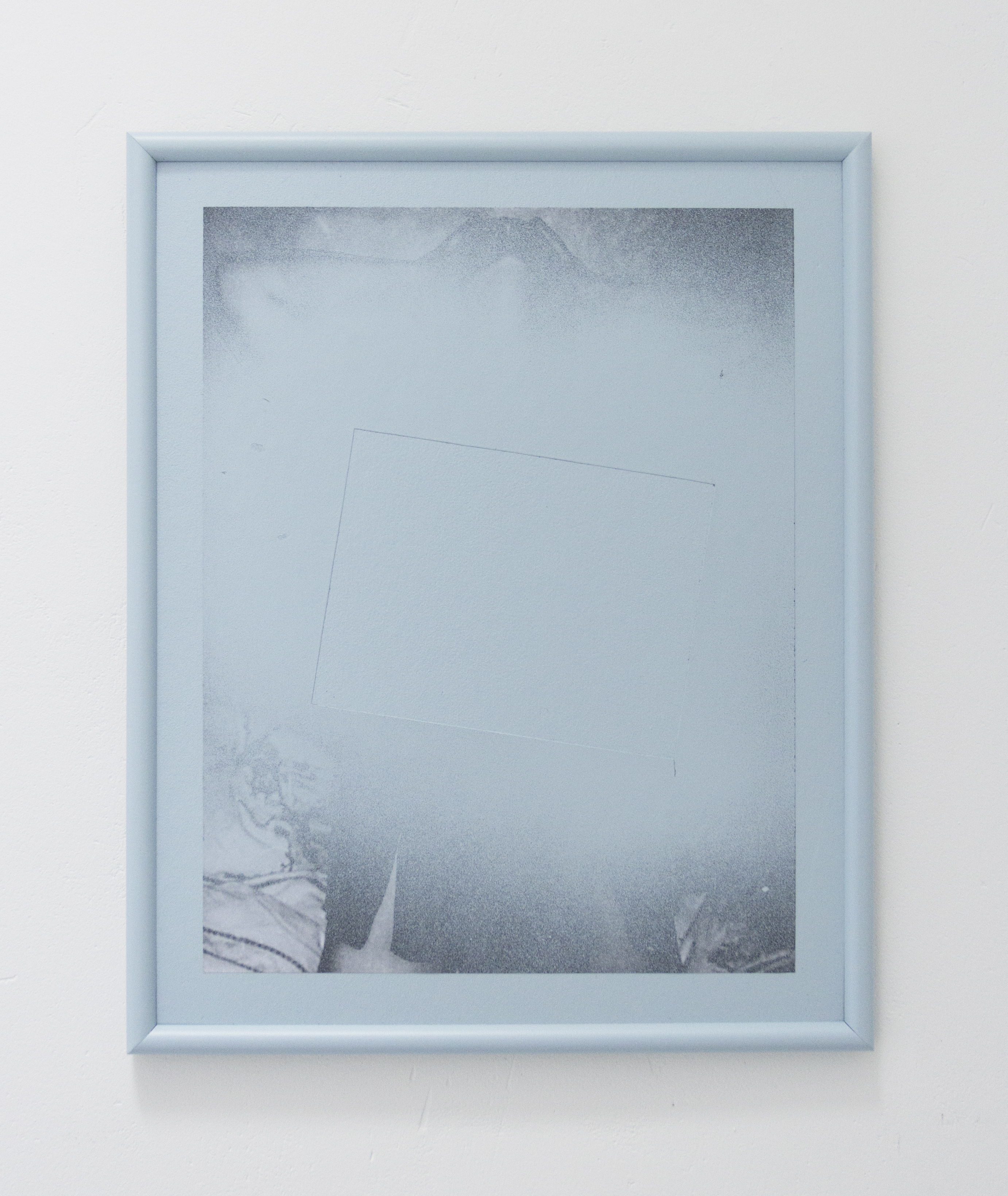 Spray paint, laserprinted paper, cardboard, wooden frame