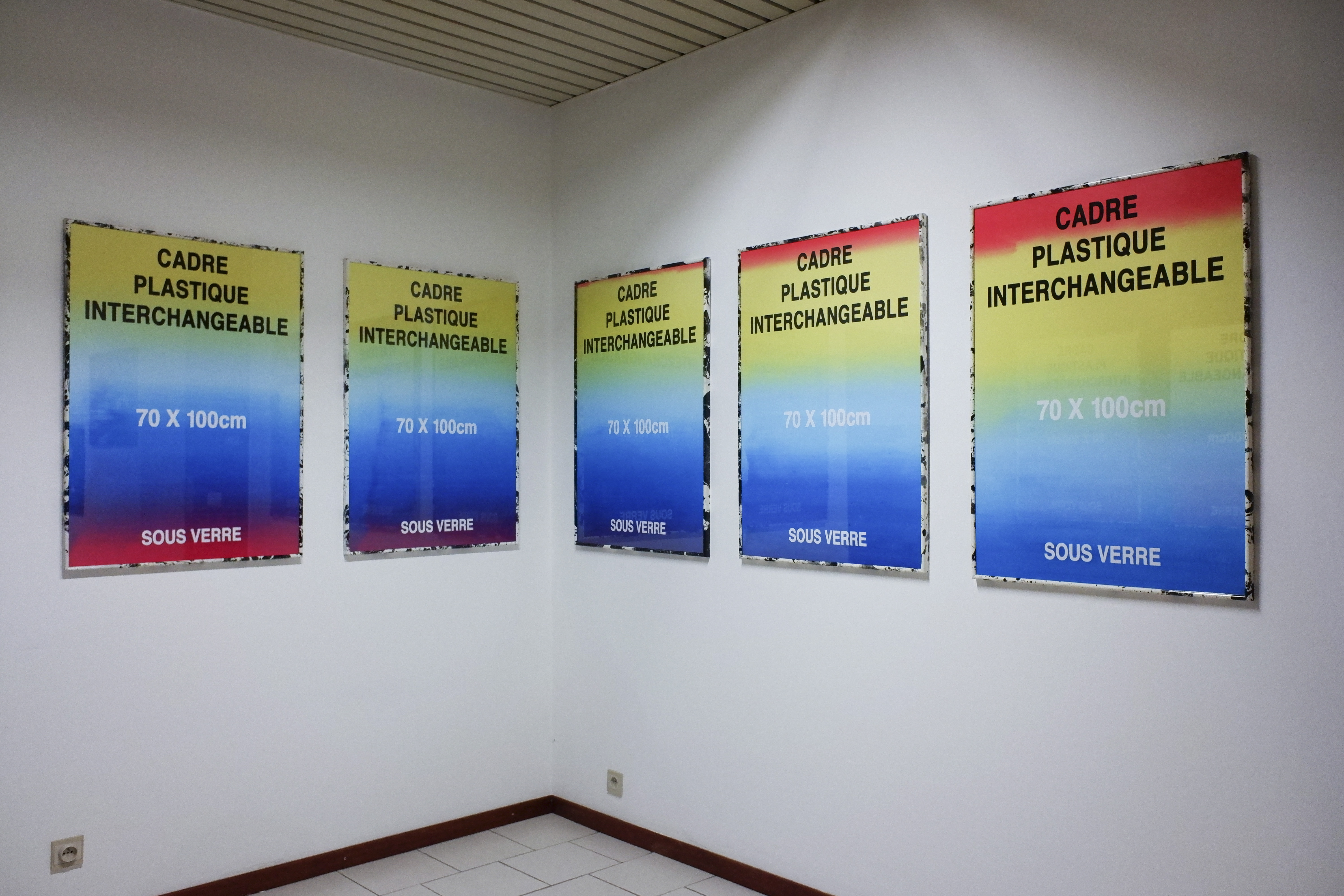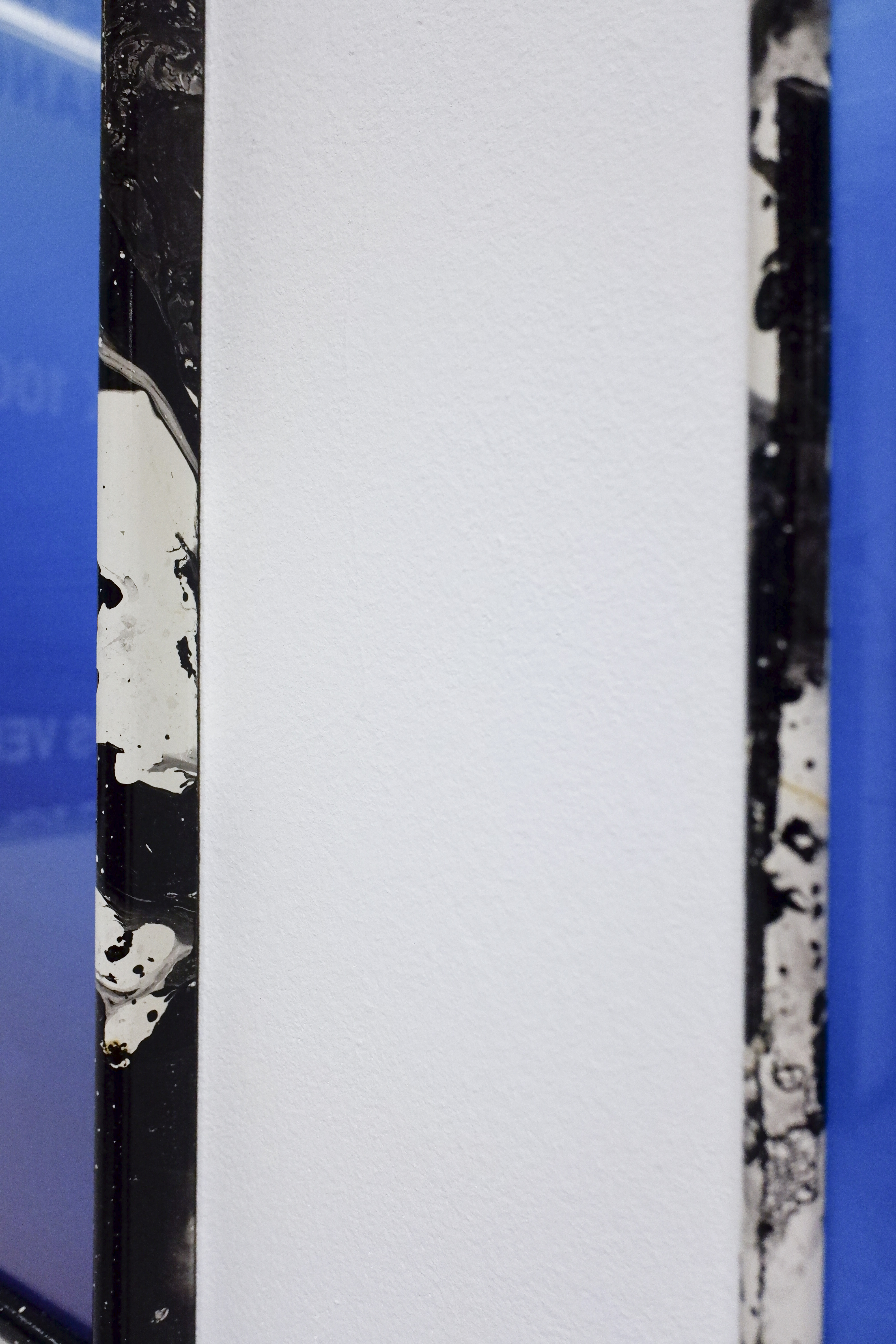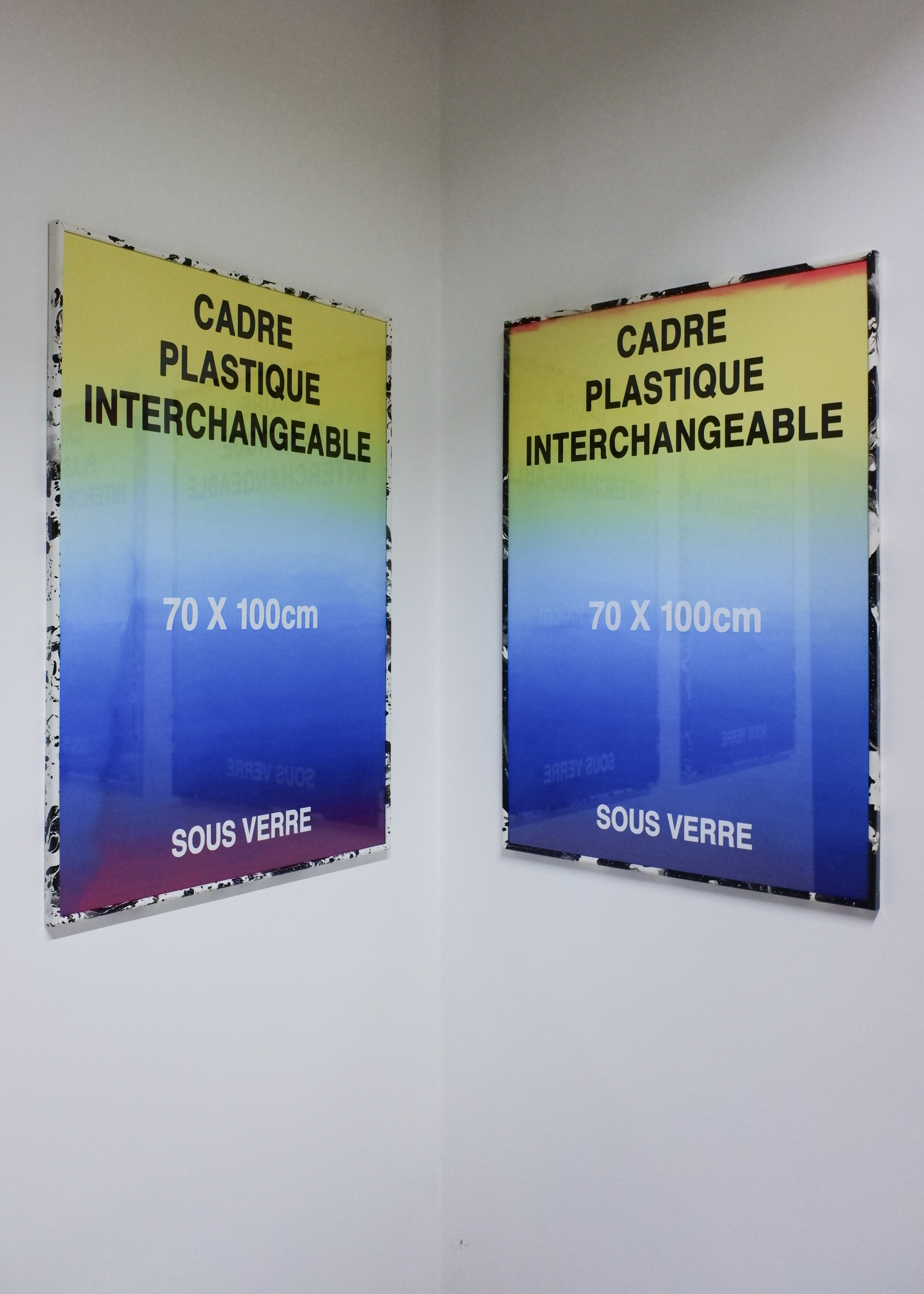Enlarged silkscreened remake of a found frame made of white plastic containing a sheet of paper that indicates its size and material.