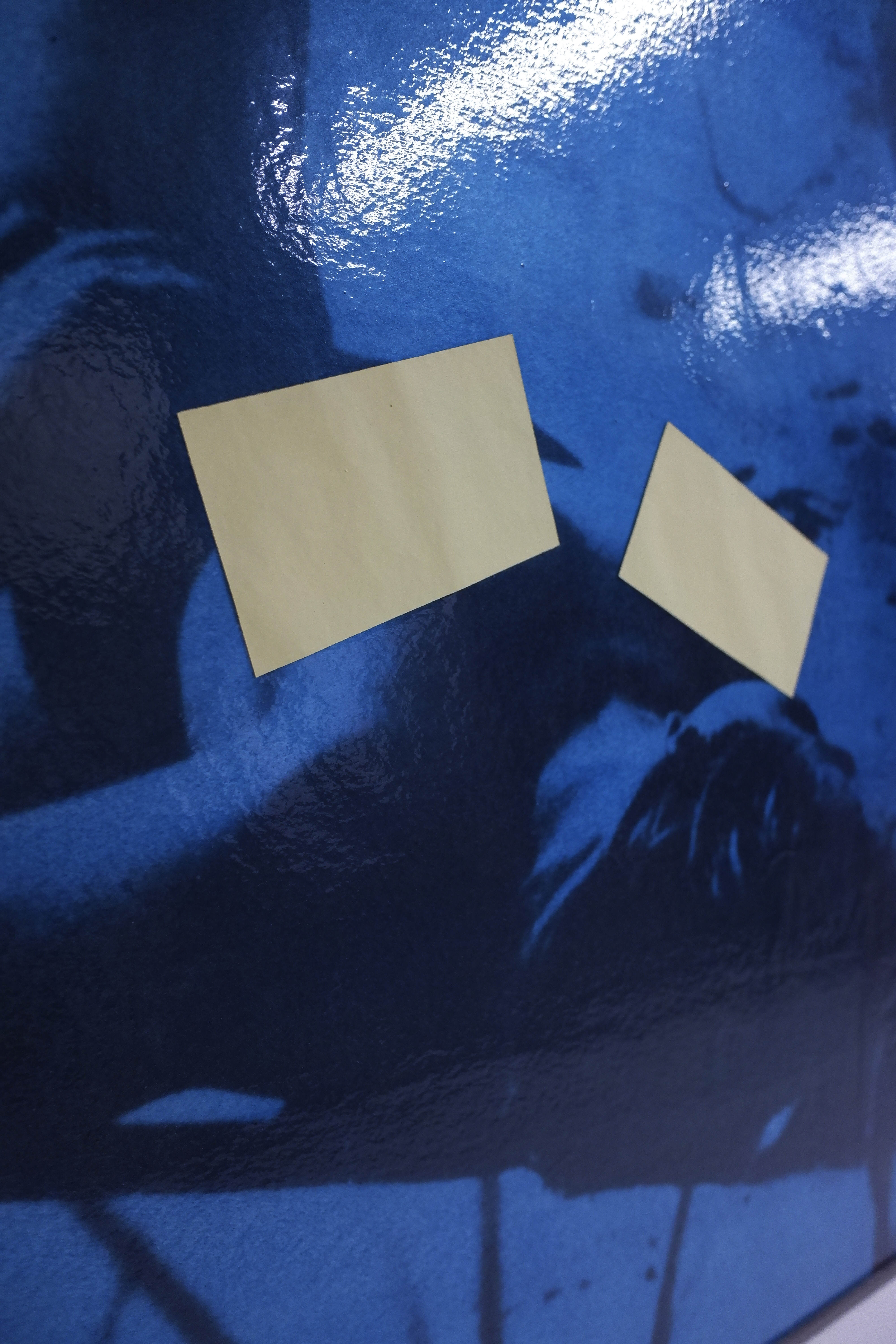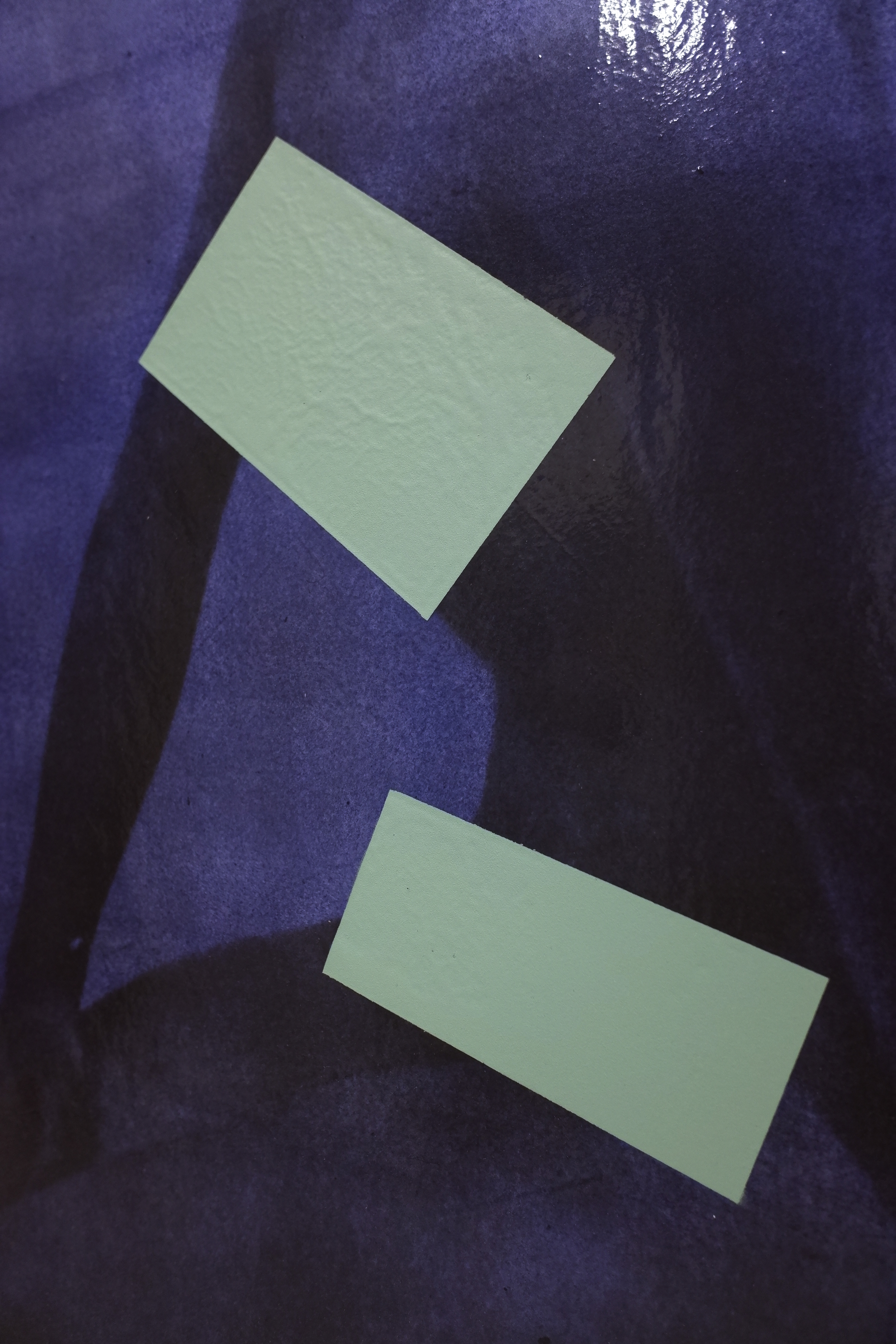 Plastic foil, varnish, pigment, acrylic paint, digitally printed PVC banner, spray paint, plastic frame, hardboard