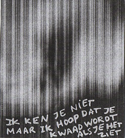 Ik ken je niet, maar ik hoop dat je kwaad wordt als je het ziet. Een digitaal ambachtelijke uitgave van Idris Sevenans en Zena Van den Block Printed in color on thin paper, cover in black and white.Edition of 2032 pages2016