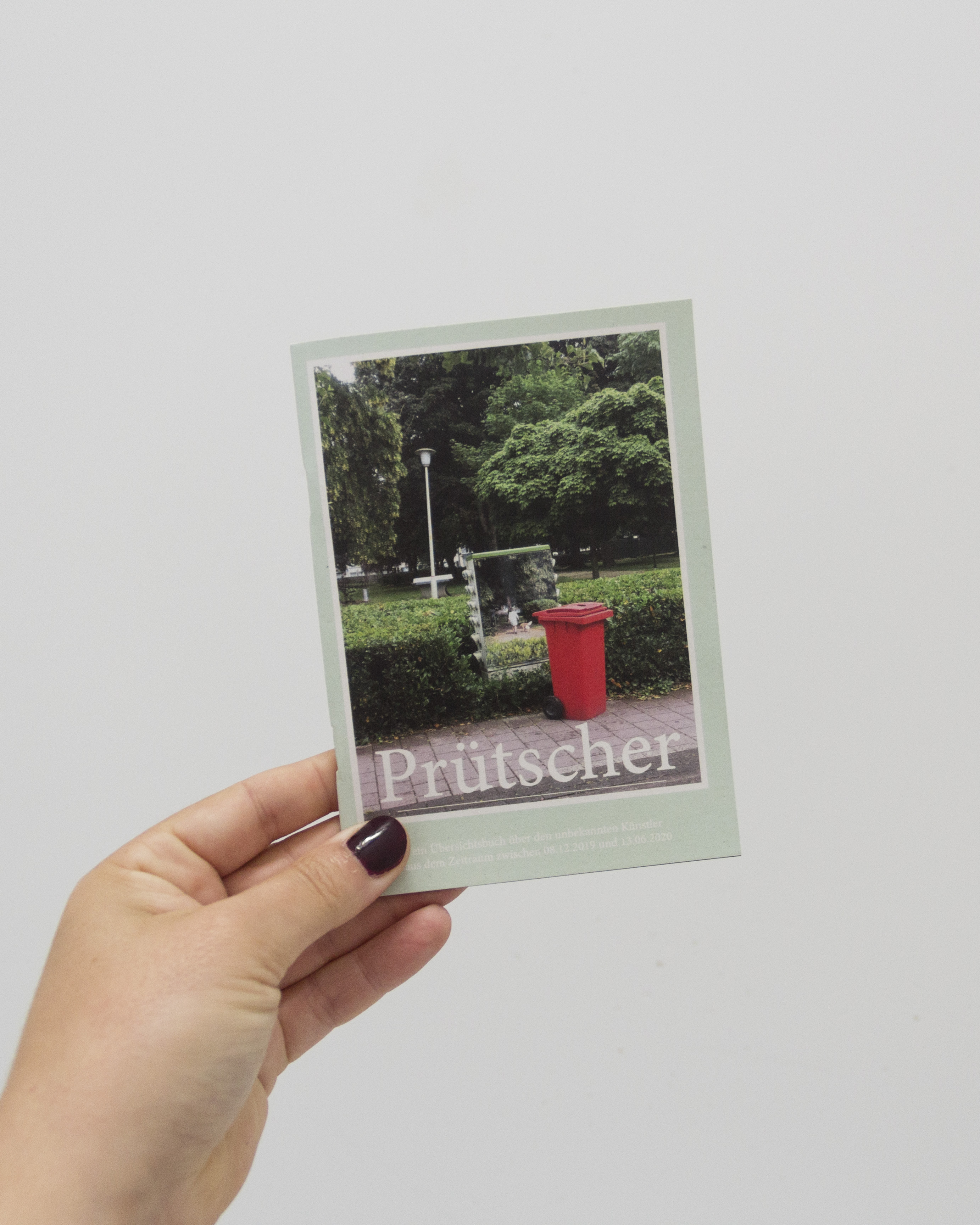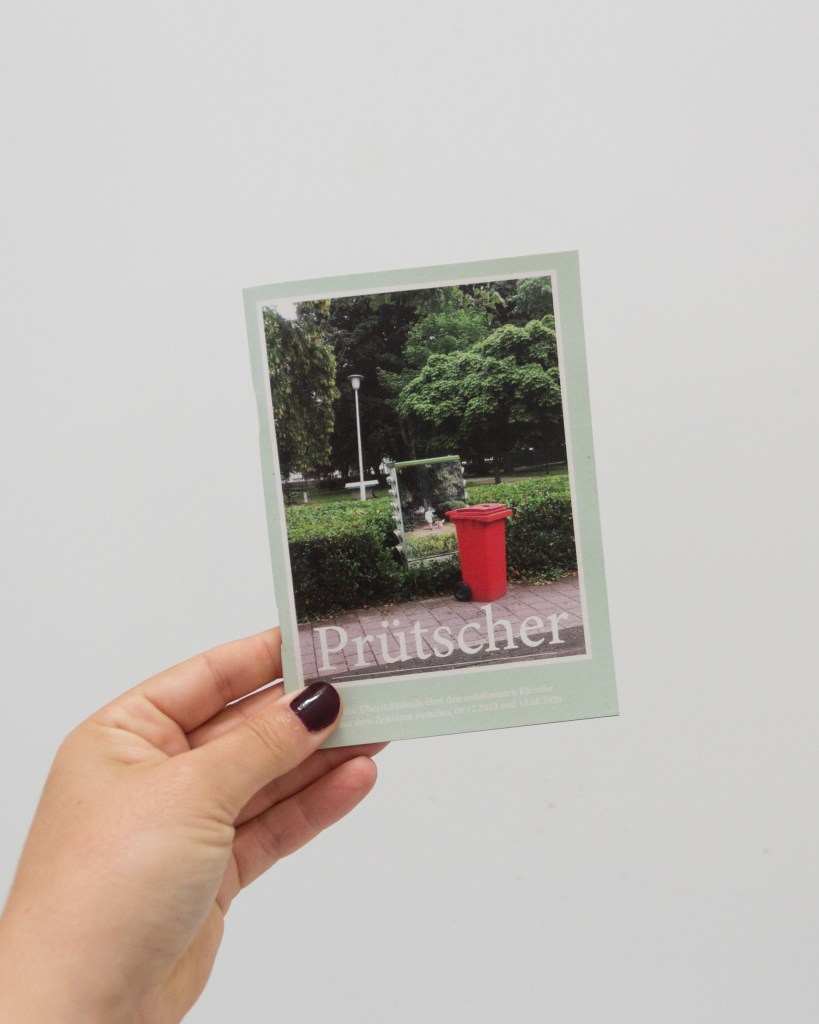 Prütscher: ein Übersichtsbuch über den unbekannten Künstler aus dem Zeitraum zwischen 08.12.2019 – 13.06.2020 Photos of works on the streets by the fictive artist Prütscher, taken with my phone between 08.12.2019 and 13.06.2020. A6Edition of 5040 pagesInside black and white, cover full color printed on recycled paper2021
